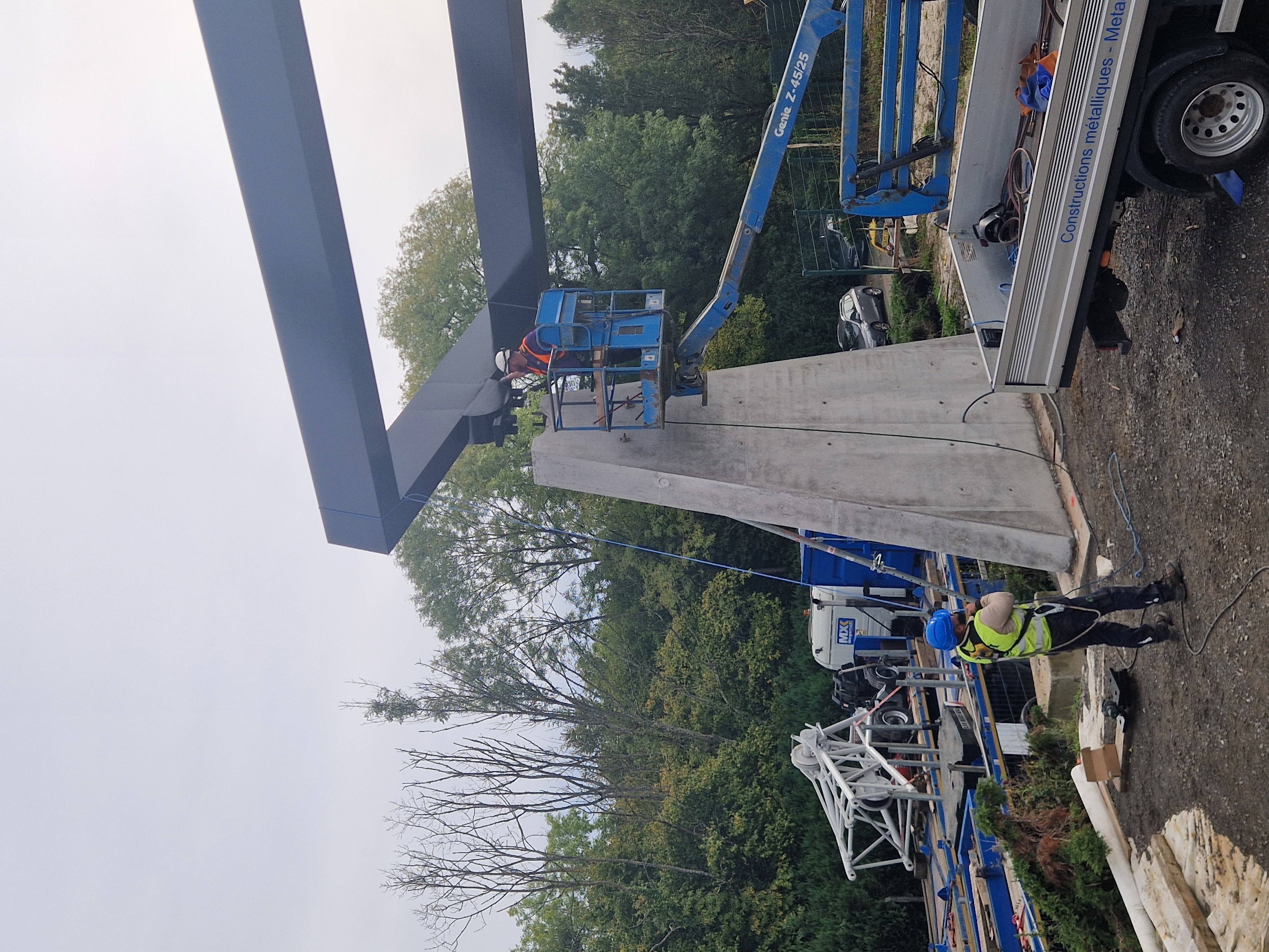 D’une portée de près de 30 m, la structure primaire est une double poutre-caisson en acier réalisée en une seule pièce, simplement déposée sur deux colonnes en béton armé encadrant le mur d’escalade extérieur.