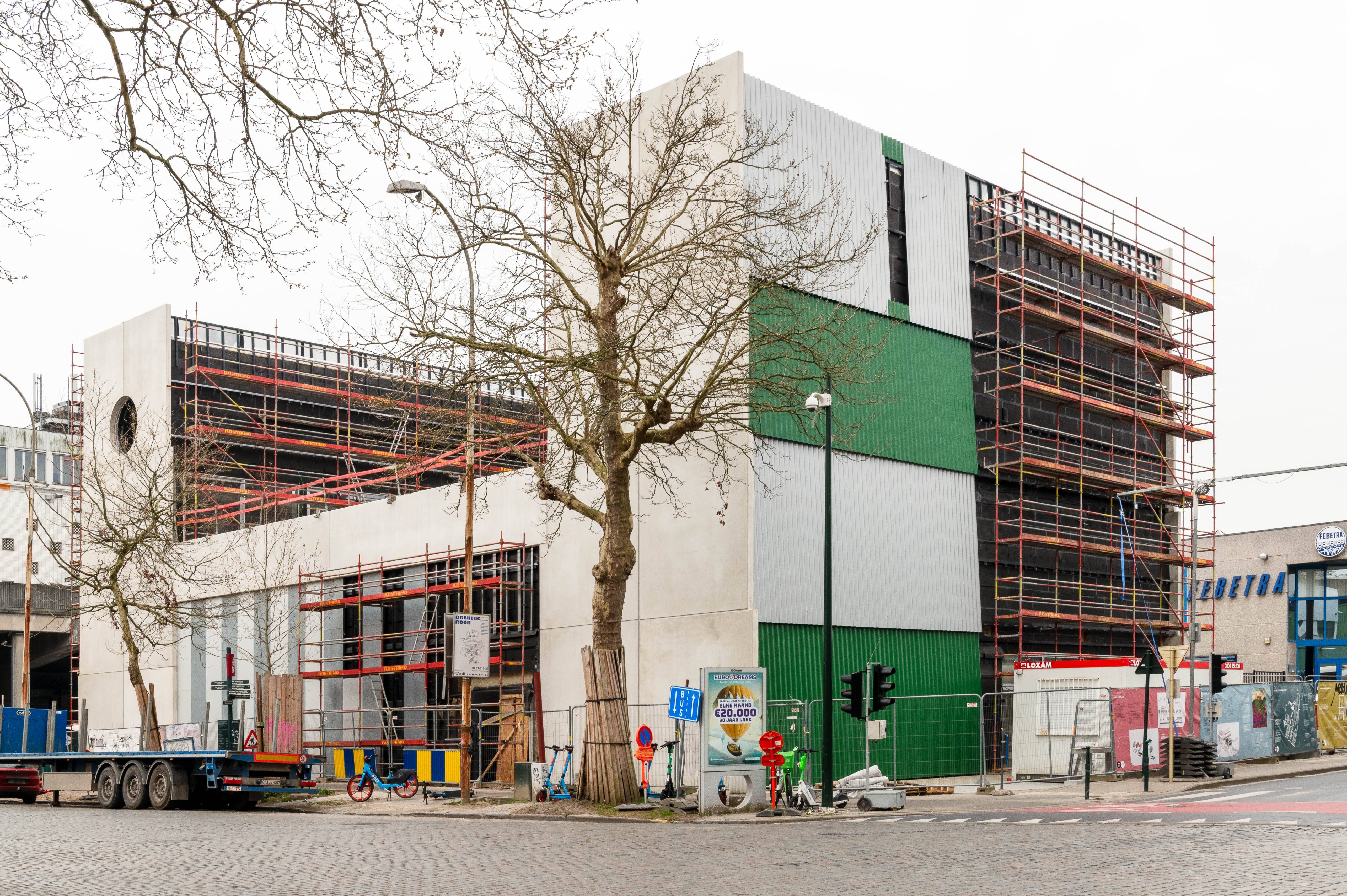 Fin des travaux de structure sur le chantier de la future salle de concert du Magasin 4 à Bruxelles, lieu emblématique de la scène punk rock alternative.