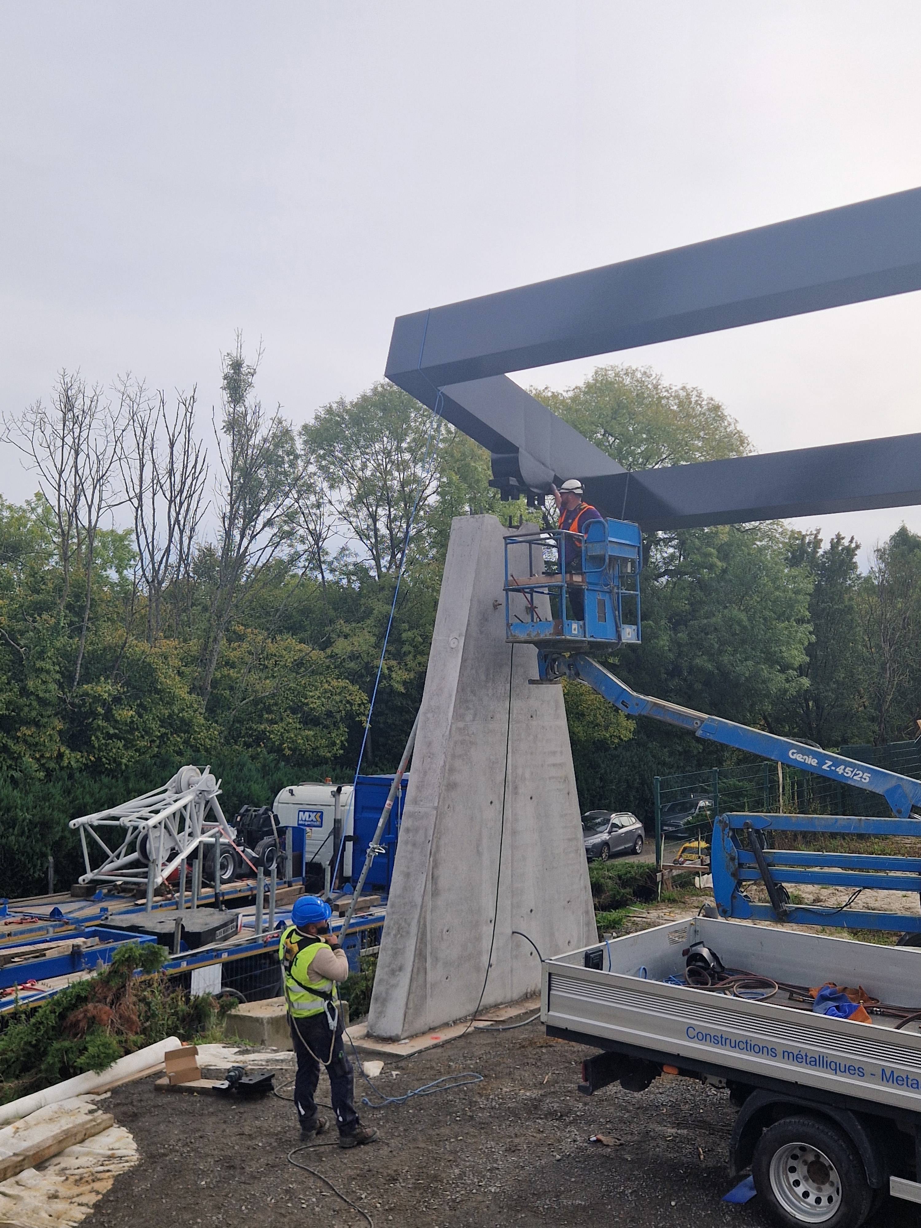 D’une portée de près de 30 m, la structure primaire est une double poutre-caisson en acier réalisée en une seule pièce, simplement déposée sur deux colonnes en béton armé encadrant le mur d’escalade extérieur.