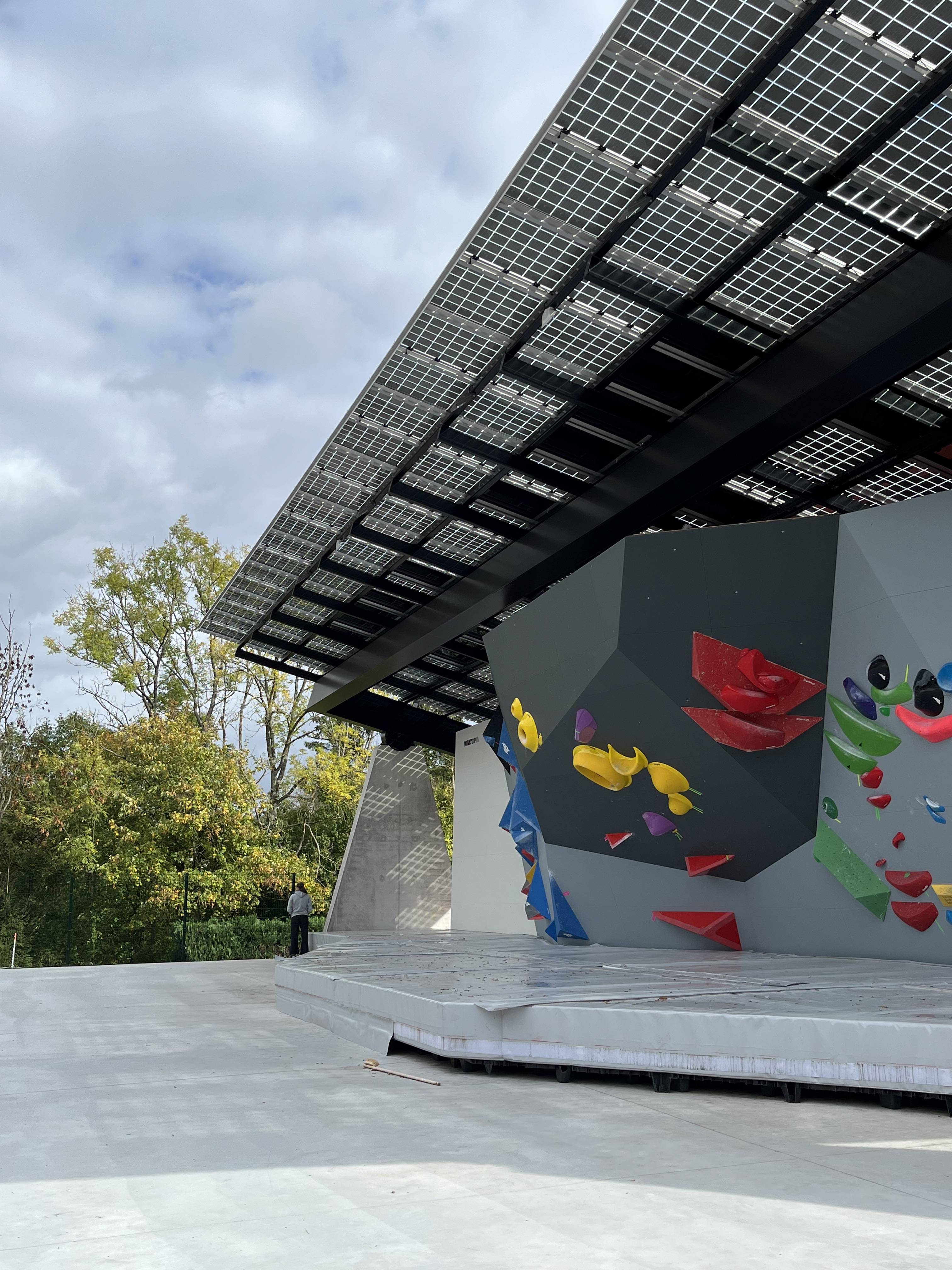 Au départ de la demande initiale (proposer un espace abrité pour la pratique de l’escalade en bloc), le projet transforme la surface couvrante en surface productive.
