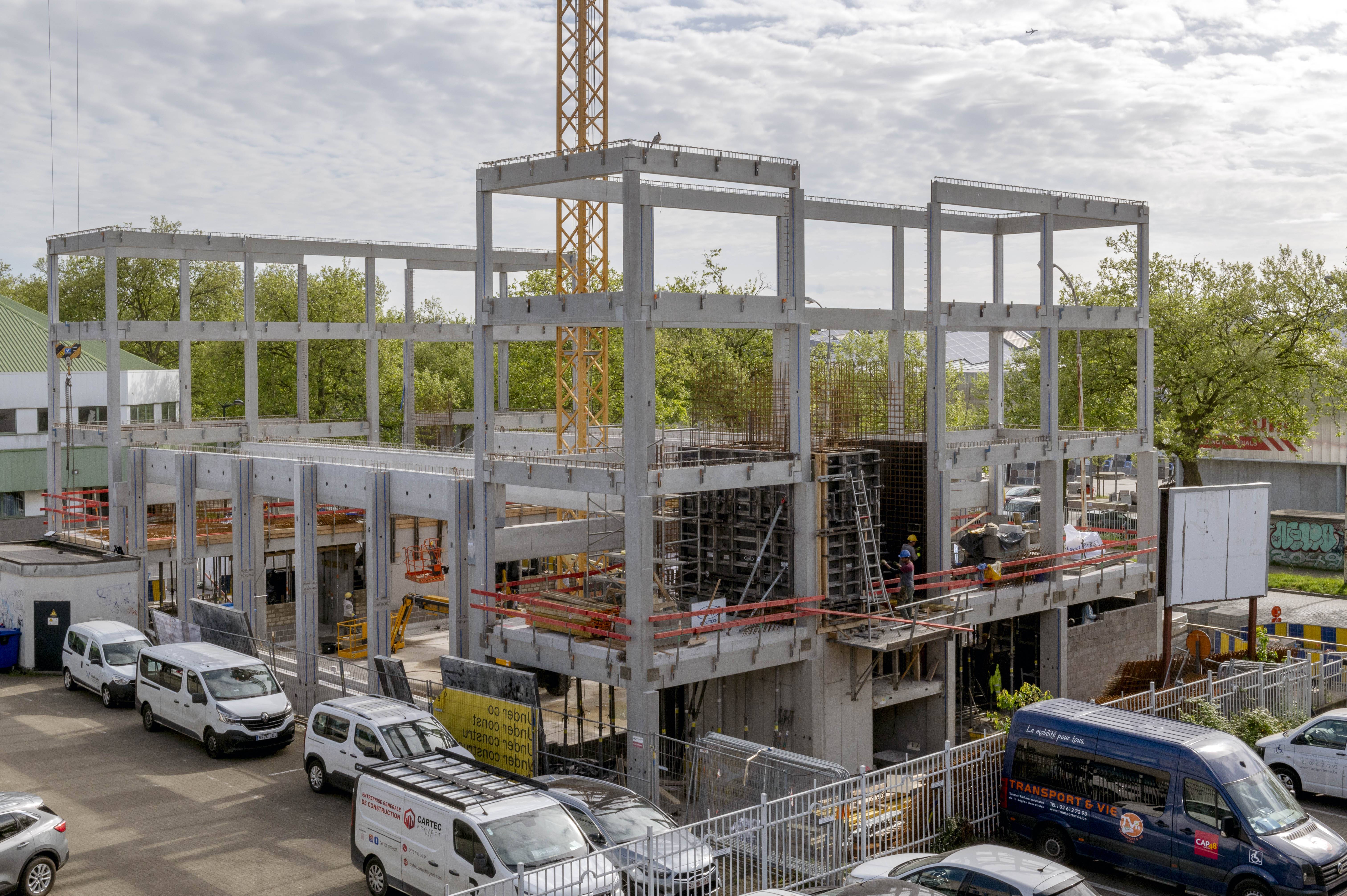 Fin des travaux de structure sur le chantier de la future salle de concert du Magasin 4 à Bruxelles, lieu emblématique de la scène punk rock alternative.